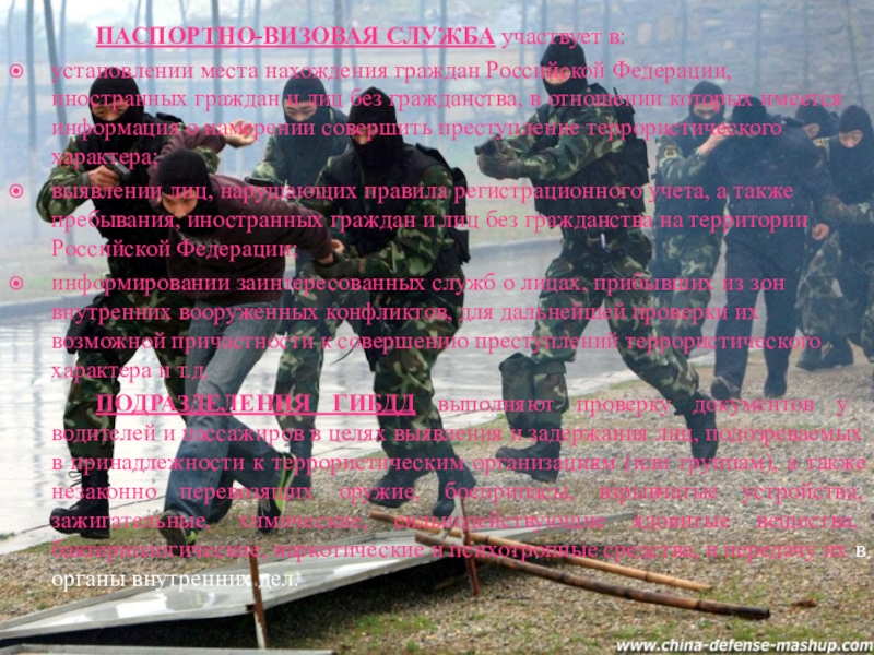 ПОДРАЗДЕЛЕНИЯ ГИБДД выполняют проверку документов у водителей и пассажиров в целях выявления и задержания лиц, подозреваемых в принадлежности к террористическим организациям (или группам), а также незаконно перевозящих оружие, боеприпасы, взрывчатые устройства, зажигательные, химические, сильнодействующие ядовитые вещества, бактериологические, наркотические и психотропные средства, и передачу их в органы внутренних дел.