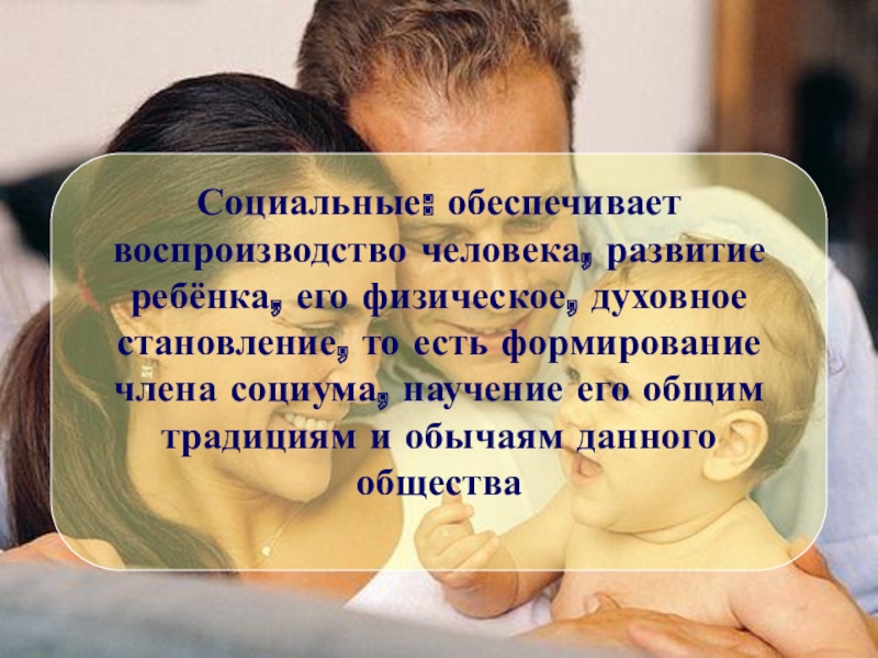 Слайд 5Социальные: обеспечивает воспроизводство человека, развитие ребёнка, его физическое, духовное становление, то
