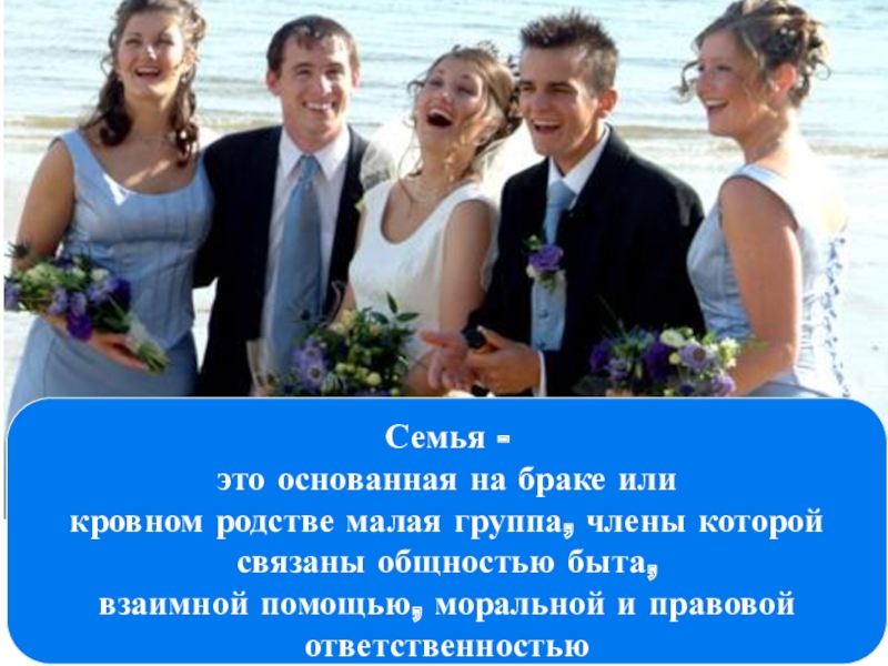 Семья - это основанная на браке или кровном родстве малая группа, члены которой связаны общностью быта,взаимной помощью,