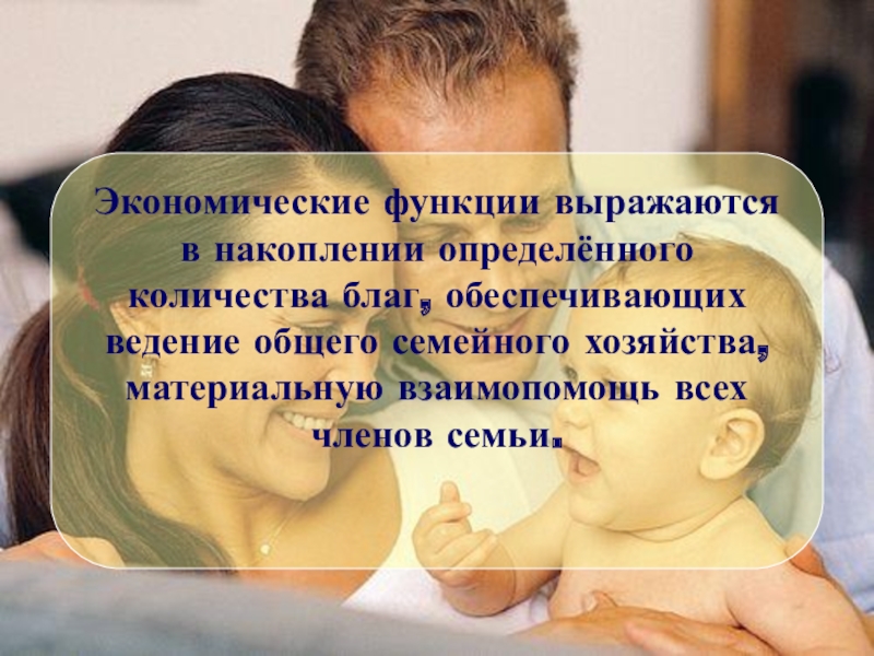 Экономические функции выражаются в накоплении определённого количества благ, обеспечивающих ведение общего семейного хозяйства, материальную взаимопомощь всех членов