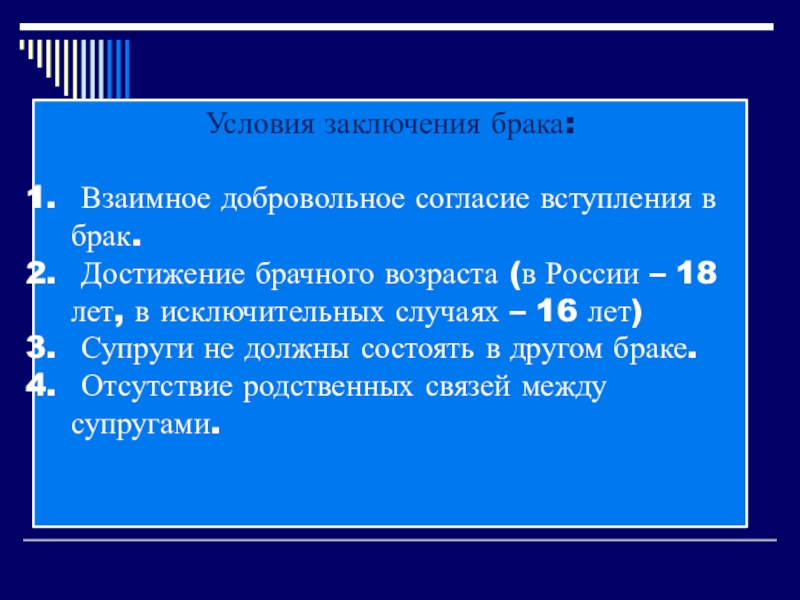 Условия заключения брака: Взаимное добровольное согласие вступления в брак. Достижение брачного возраста (в России – 18 лет,