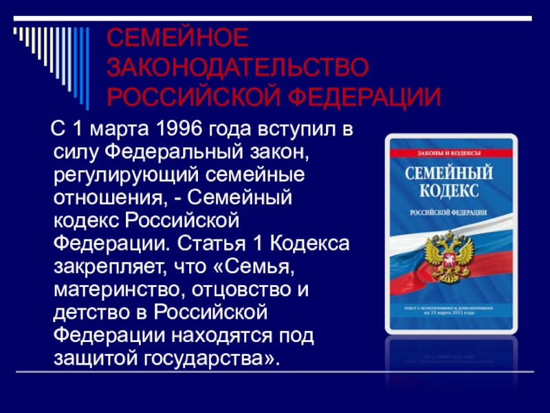 СЕМЕЙНОЕ ЗАКОНОДАТЕЛЬСТВО РОССИЙСКОЙ ФЕДЕРАЦИИ  С 1 марта 1996 года вступил в силу Федеральный закон, регулирующий семейные