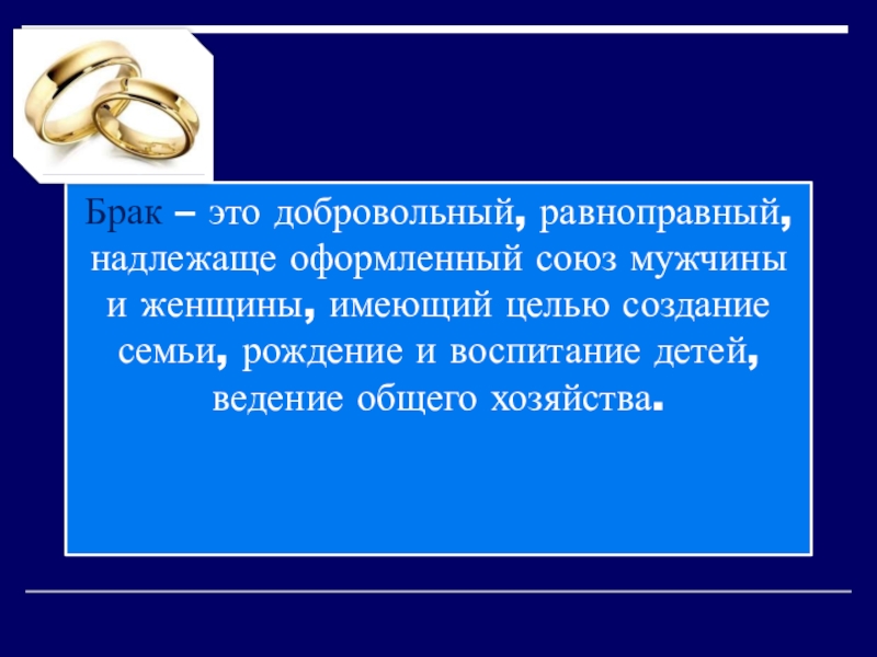 Брак – это добровольный, равноправный, надлежаще оформленный союз мужчины и женщины, имеющий целью создание семьи, рождение и