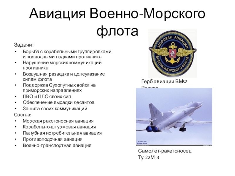 Предназначены для уничтожения надводных кораблей, десантных отрядов и конвоев противника, прикрытия пунктов базирования, береговых объектов флота, прибрежных морских коммуникаций и группировок войск, действующих на приморских направлениях. Кроме того, могут привлекаться для разрушения пунктов базирования и портов противника.