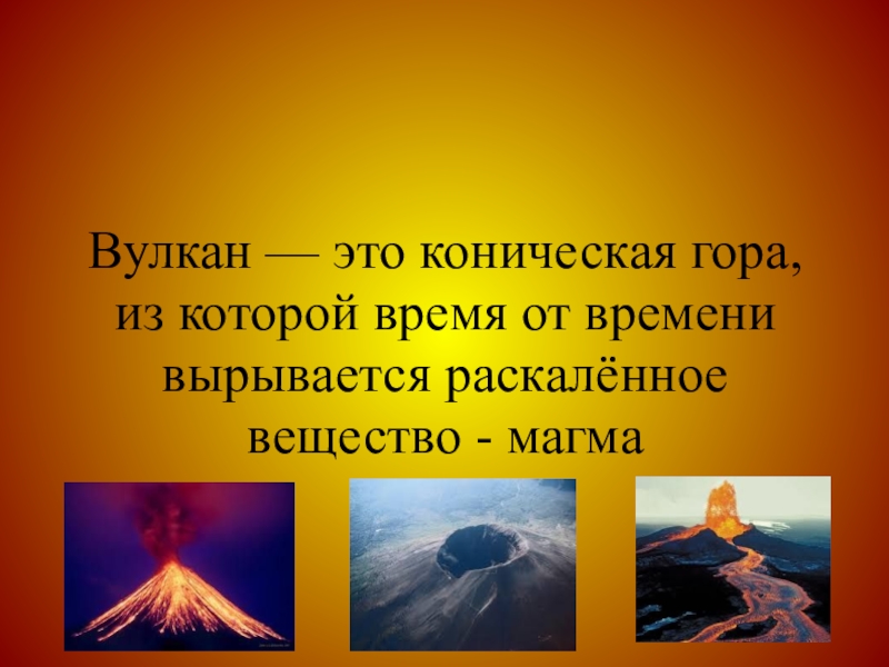 Вулкан — это коническая гора, из которой время от времени вырывается раскалённое вещество - магма