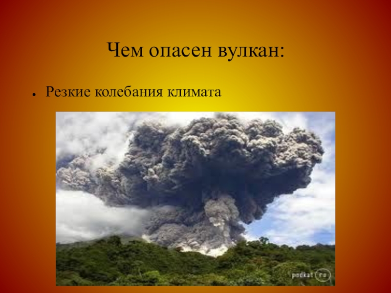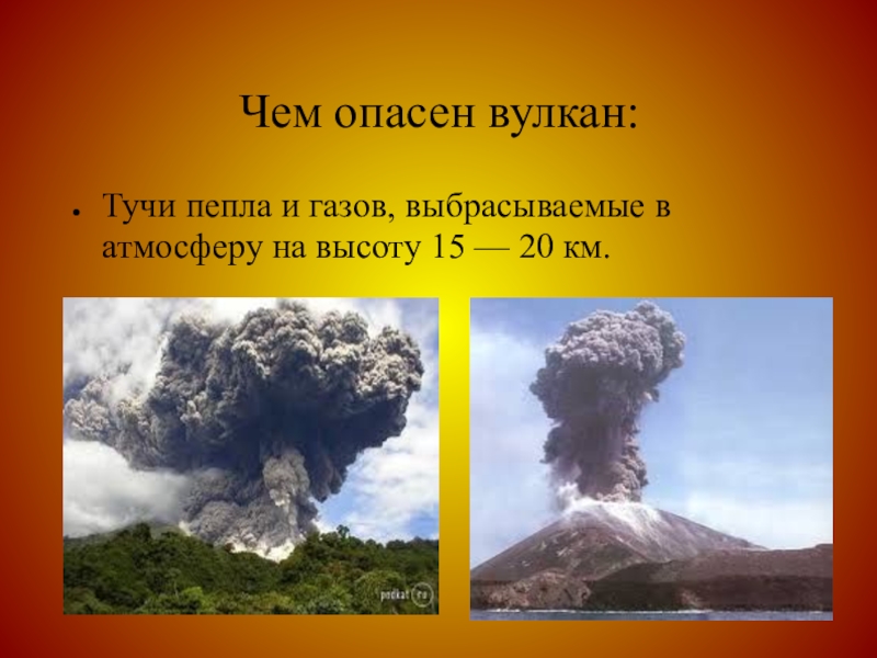 Чем опасен вулкан:Тучи пепла и газов, выбрасываемые в атмосферу на высоту 15 — 20 км.