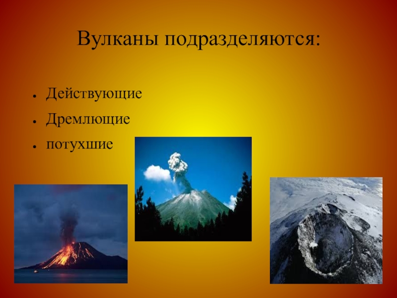 Вулканы подразделяются: ДействующиеДремлющиепотухшие