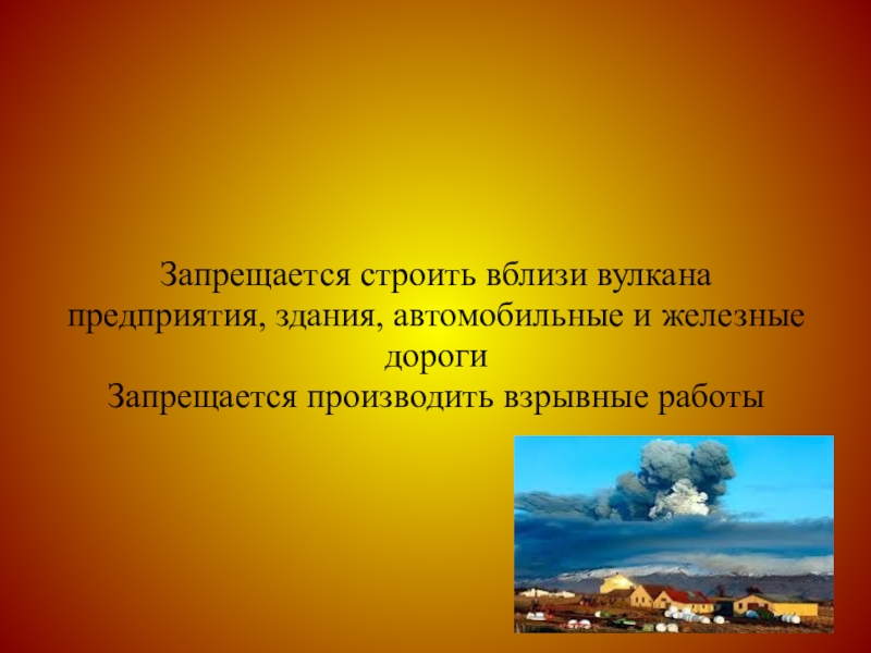 Слайд 18Запрещается строить вблизи вулкана предприятия, здания, автомобильные и железные дороги