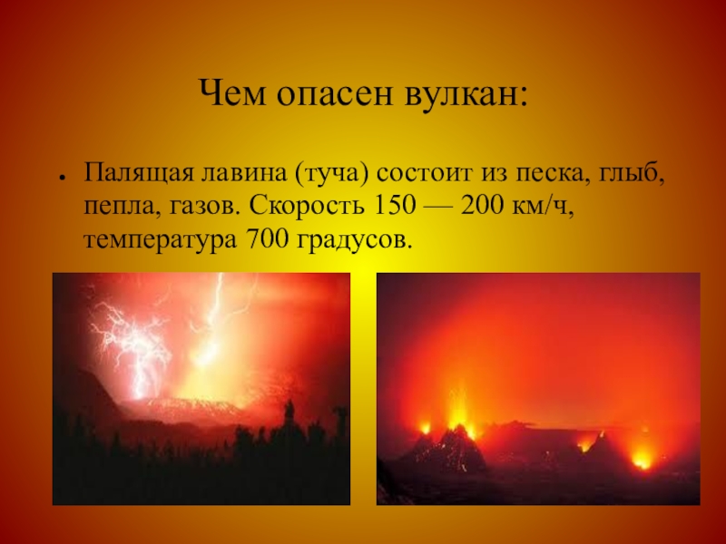 Чем опасен вулкан:Палящая лавина (туча) состоит из песка, глыб, пепла, газов. Скорость 150 — 200 км/ч, температура