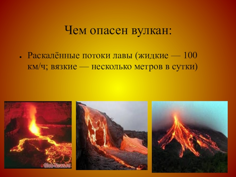 Чем опасен вулкан:Раскалённые потоки лавы (жидкие — 100 км/ч; вязкие — несколько метров в сутки)