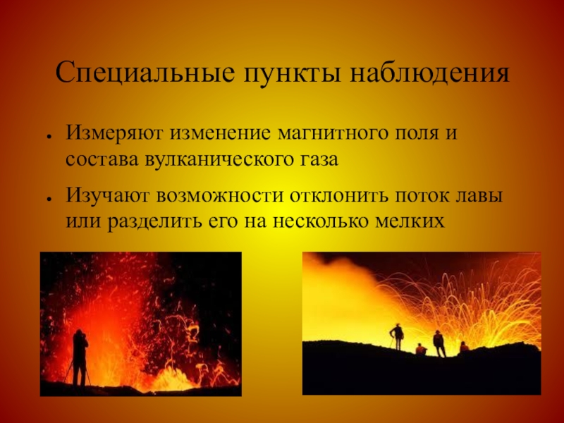 Специальные пункты наблюденияИзмеряют изменение магнитного поля и состава вулканического газаИзучают возможности отклонить поток лавы или разделить его