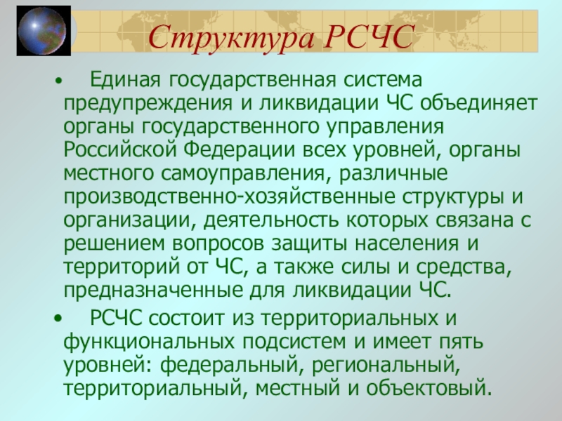управления Российской Федерации всех уровней, органы местного самоуправления, различные производственно-хозяйственные структуры и организации, деятельность которых связана с решением вопросов защиты населения и территорий от ЧС, а также силы и средства, предназначенные для ликвидации ЧС.