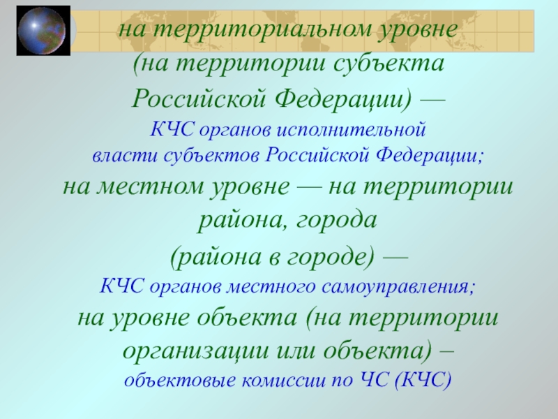РСЧС состоит из территориальных и функциональных подсистем и имеет пять уровней: федеральный, региональный, территориальный, местный и объектовый.