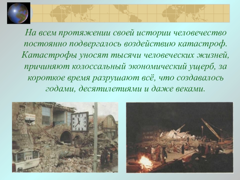 Слайд 2На всем протяжении своей истории человечество постоянно подвергалось воздействию катастроф. Катастрофы