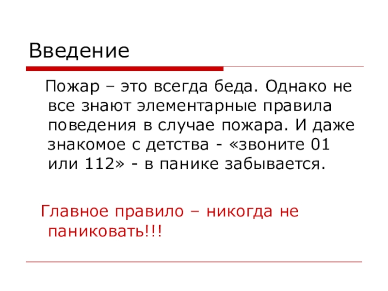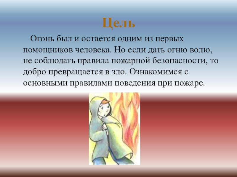 помощников человека. Но если дать огню волю, не соблюдать правила пожарной безопасности, то добро превращается в зло. Ознакомимся с основными правилами поведения при пожаре.