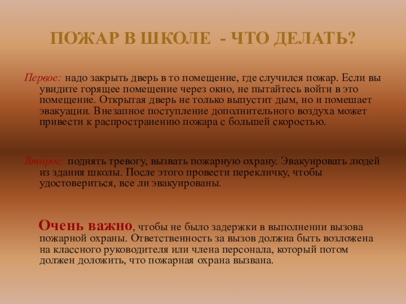 Очень важно, чтобы не было задержки в выполнении вызова пожарной охраны. Ответственность за вызов должна быть возложена на классного руководителя или члена персонала, который потом должен доложить, что пожарная охрана вызвана.