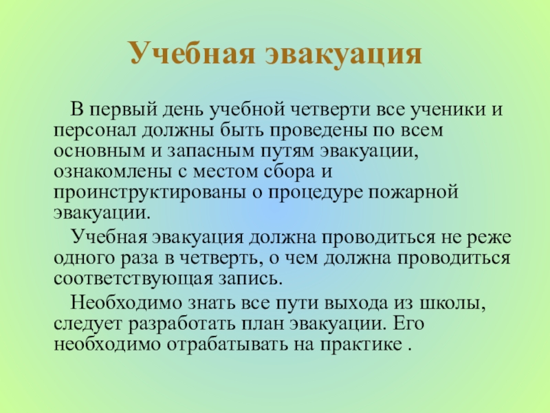 Необходимо знать все пути выхода из школы, следует разработать план эвакуации. Его необходимо отрабатывать на практике .