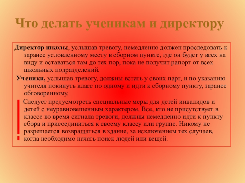 Следует предусмотреть специальные меры для детей инвалидов и детей с неуравновешенным характером. Все, кто не присутствует в классе во время сигнала тревоги, должны немедленно идти к пункту сбора и присоединиться к своему классу или группе. Никому не разрешается возвращаться в здание, за исключением тех случаев, когда необходимо начать поиск людей или вещей.