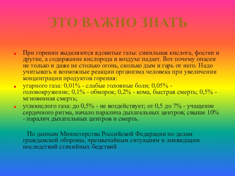 другие, а содержание кислорода в воздухе падает. Вот почему опасен не только и даже не столько огонь, сколько дым и гарь от него. Надо учитывать и возможные реакции организма человека при увеличении концентрации продуктов горения: