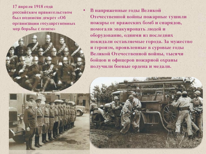 В напряженные годы Великой Отечественной войны пожарные тушили пожары от вражеских бомб и снарядов, помогали эвакуировать людей и оборудование, одними из последних покидали оставляемые города. За мужество и героизм, проявленные в суровые годы Великой Отечественной войны, тысячи бойцов и офицеров пожарной охраны получили боевые ордена и медали.