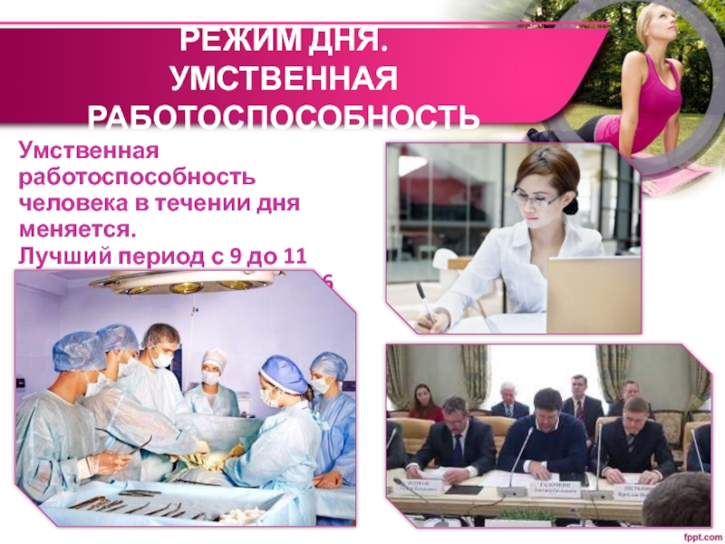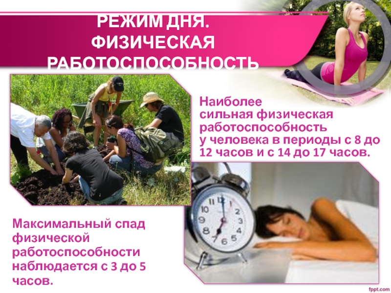 Наиболее сильная физическая работоспособность у человека в периоды с 8 до 12 часов и с 14 до 17 часов.