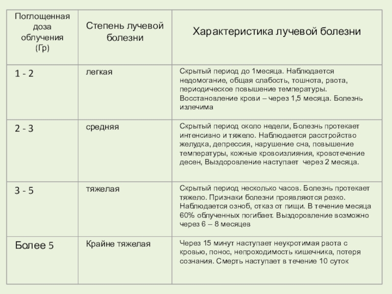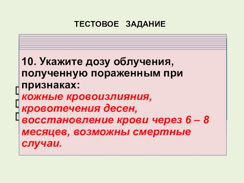10. Укажите дозу облучения, полученную пораженным при признаках: