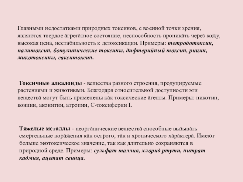 Токсичные алкалоиды - вещества разного строения, продуцируемые растениями и животными. Благодаря относительной доступности эти вещества могут быть применены как токсические агенты. Примеры: никотин, кониин, аконитин, атропин, С-токсиферин I.