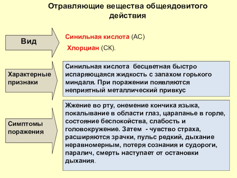 Синильная кислота бесцветная быстро испаряющаяся жидкость с запахом горького миндаля. При поражении появляются неприятный металлический привкус