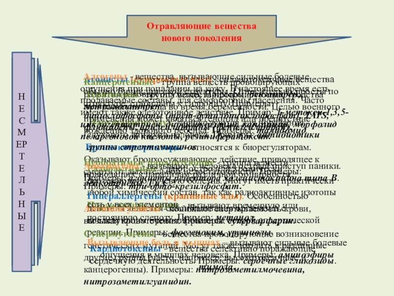 Канцерогенные - группа веществ провоцирующих развития раковых опухолей. Примеры: бензaпирен, метилхолантрен
