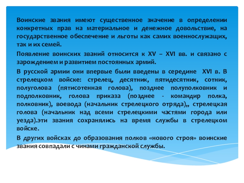 Слайд 2Воинские звания имеют существенное значение в определении конкретных прав на материальное