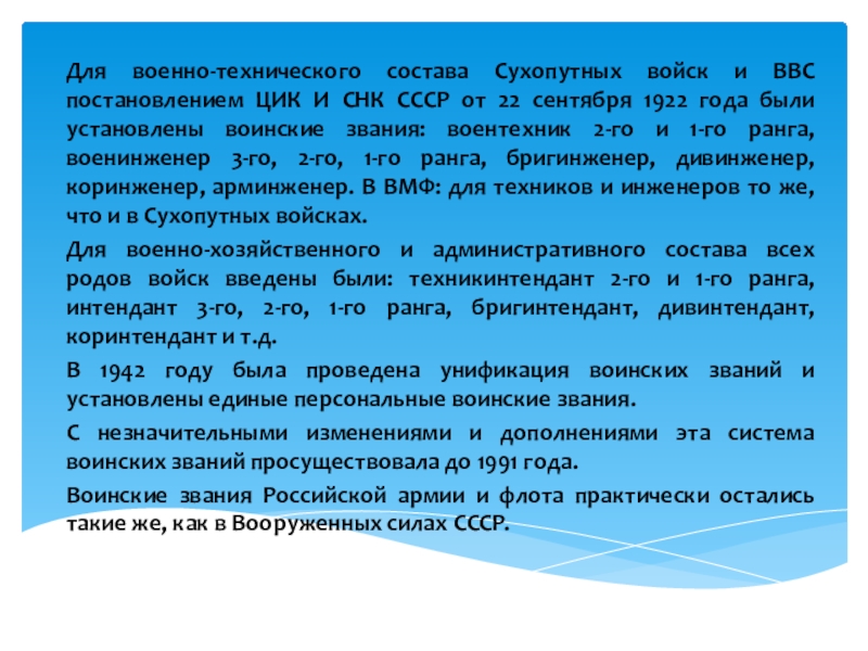 Слайд 4Для военно-технического состава Сухопутных войск и ВВС постановлением ЦИК И СНК