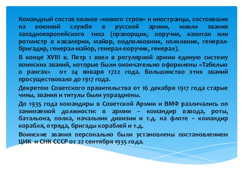 В конце ХVIII в. Петр 1 ввел в регулярной армии единую систему воинских званий, которые были окончательно оформлены «Табелью о рангах» от 24 января 1722 года. Большинство этих званий просуществовало до 1917 года.