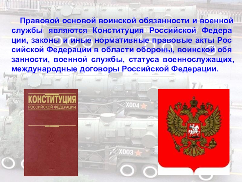 являются Конституция Российской Федерации, законы и иные нормативные правовые акты Российской Федерации в области обороны, воинской обязанности, военной службы, статуса военнослужащих, международные договоры Российской Федерации.