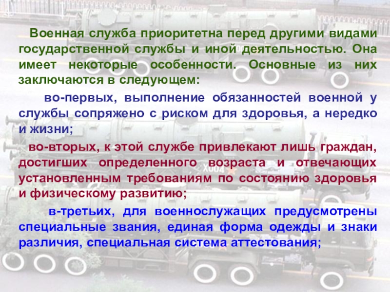 во-первых, выполнение обязанностей военной у службы сопряжено с риском для здоровья, а нередко и жизни;