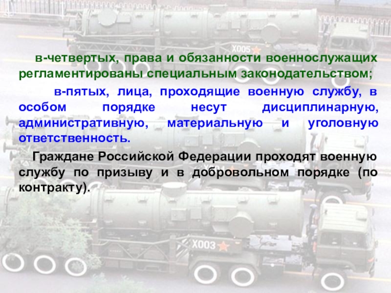 в-пятых, лица, проходящие военную службу, в особом порядке несут дисциплинарную, административную, материальную и уголовную ответственность.
