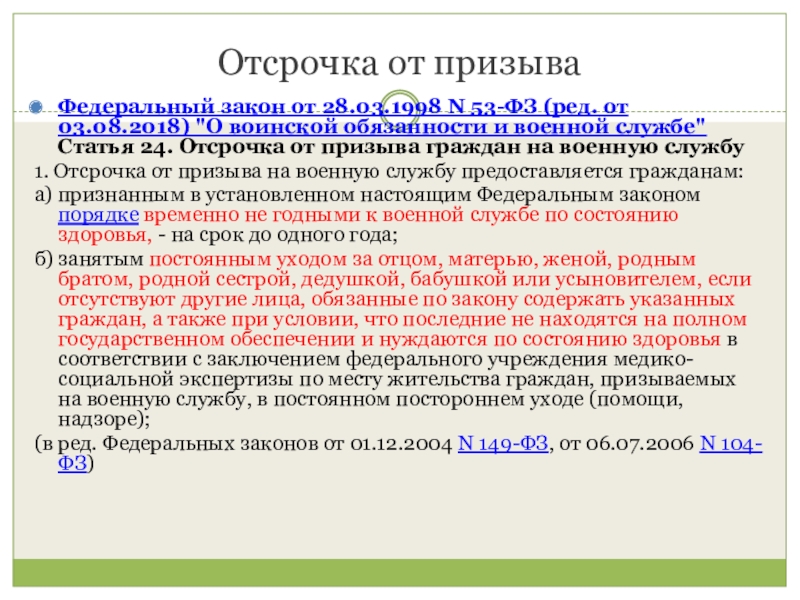 03.08.2018) "О воинской обязанности и военной службе"Статья 24. Отсрочка от призыва граждан на военную службу