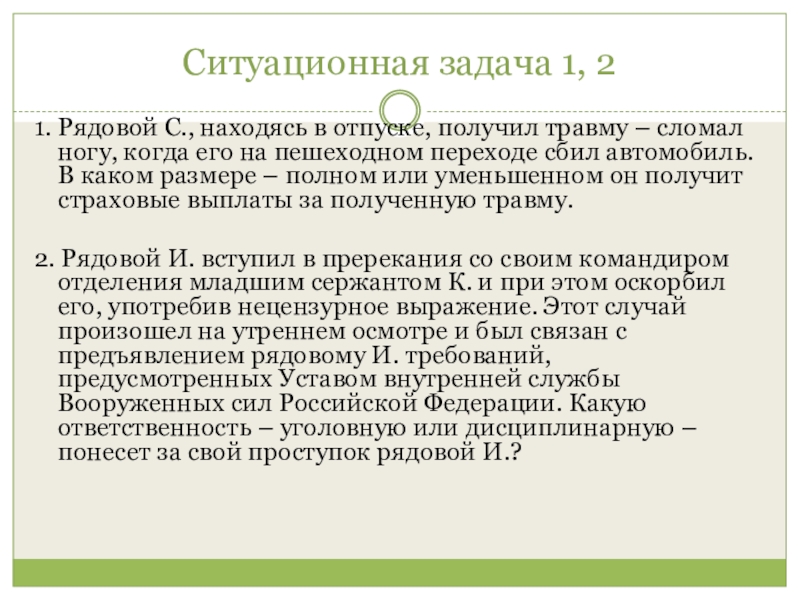 2. Рядовой И. вступил в пререкания со своим командиром отделения младшим сержантом К. и при этом оскорбил его, употребив нецензурное выражение. Этот случай произошел на утреннем осмотре и был связан с предъявлением рядовому И. требований, предусмотренных Уставом внутренней службы Вооруженных сил Российской Федерации. Какую ответственность – уголовную или дисциплинарную – понесет за свой проступок рядовой И.?