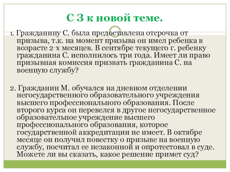 призыва, т.к. на момент призыва он имел ребенка в возрасте 2‑х месяцев. В сентябре текущего г. ребенку гражданина С. исполнилось три года. Имеет ли право призывная комиссия призвать гражданина С. на военную службу?