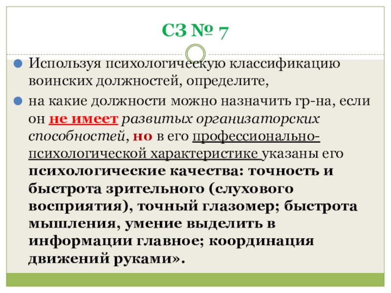 можно назначить гр-на, если он не имеет развитых организаторских способностей, но в его профессионально-психологической характеристике указаны его психологические качества: точность и быстрота зрительного (слухового восприятия), точный глазомер; быстрота мышления, умение выделить в информации главное; координация движений руками».