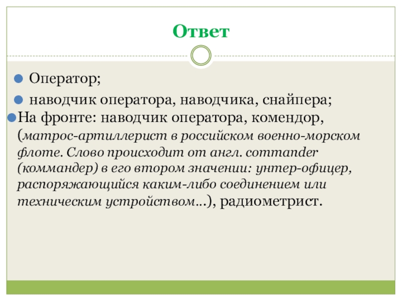 в российском военно-морском флоте. Слово происходит от англ. сommander (коммандер) в его втором значении: унтер-офицер, распоряжающийся каким-либо соединением или техническим устройством...), радиометрист.