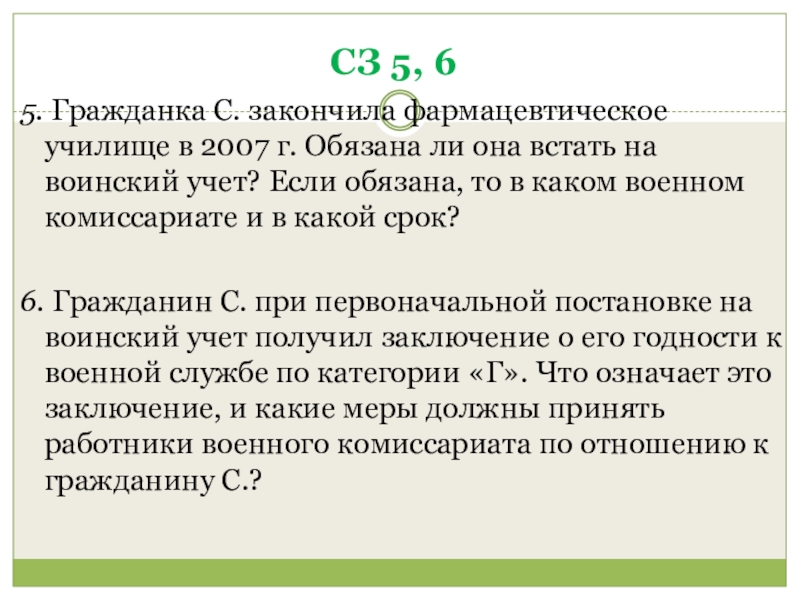 6. Гражданин С. при первоначальной постановке на воинский учет получил заключение о его годности к военной службе по категории «Г». Что означает это заключение, и какие меры должны принять работники военного комиссариата по отношению к гражданину С.?