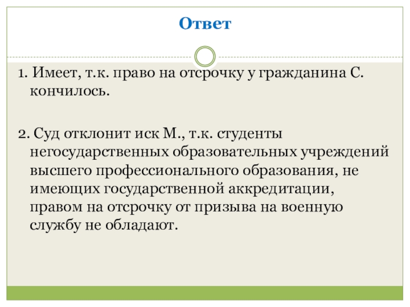 2. Гражданин М. обучался на дневном отделении негосударственного образовательного учреждения высшего профессионального образования. После второго курса он перевелся в другое негосударственное образовательное учреждение высшего профессионального образования, которое государственной аккредитации не имеет. В октябре месяце он получил повестку о призыве на военную службу, посчитал ее незаконной и опротестовал в суде. Можете ли вы сказать, какое решение примет суд?
