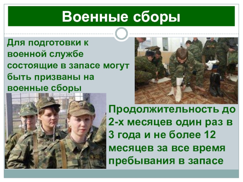 Продолжительность до 2-х месяцев один раз в 3 года и не более 12 месяцев за все время пребывания в запасе