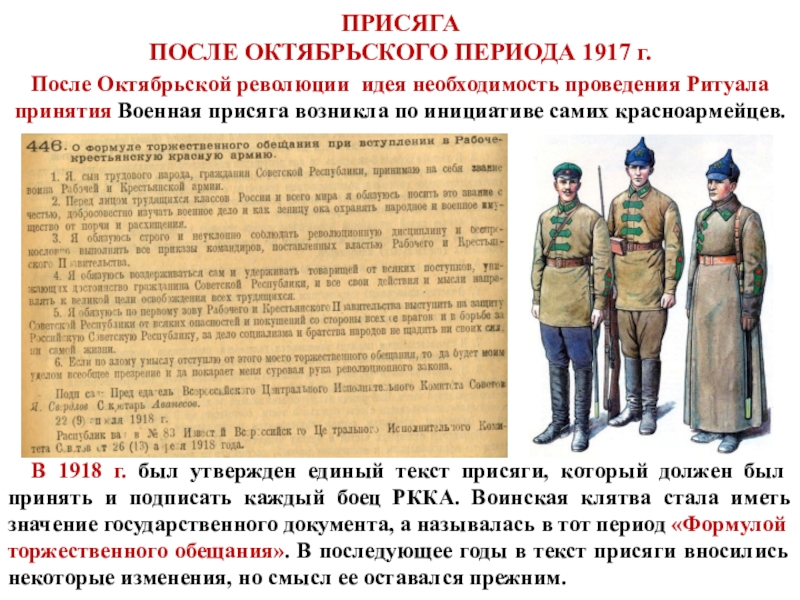 В 1918 г. был утвержден единый текст присяги, который должен был принять и подписать каждый боец РККА. Воинская клятва стала иметь значение государственного документа, а называлась в тот период «Формулой торжественного обещания». В последующее годы в текст присяги вносились некоторые изменения, но смысл ее оставался прежним.