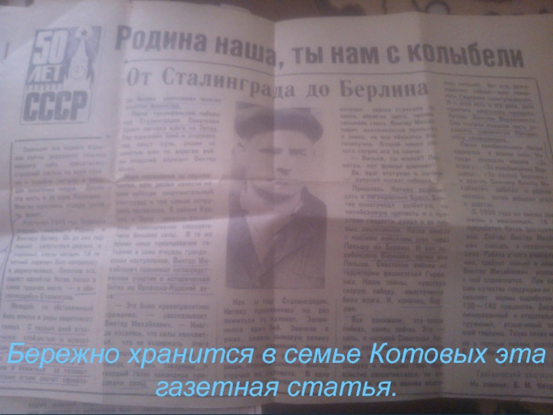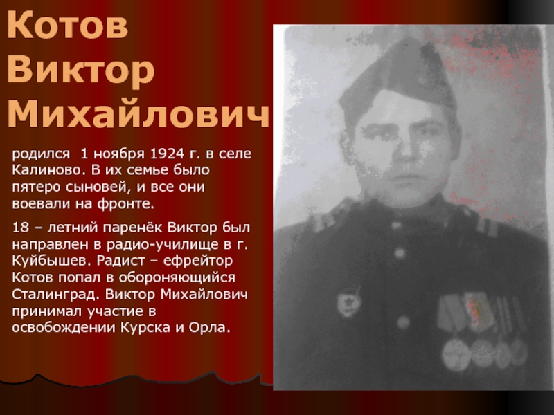 18 – летний паренёк Виктор был направлен в радио-училище в г. Куйбышев. Радист – ефрейтор Котов попал в обороняющийся Сталинград. Виктор Михайлович принимал участие в освобождении Курска и Орла.