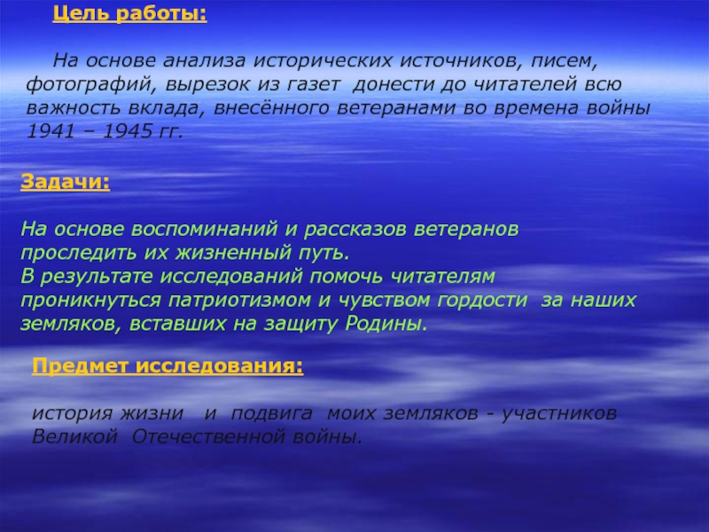 В результате исследований помочь читателям проникнуться патриотизмом и чувством гордости за наших земляков, вставших на защиту Родины.
