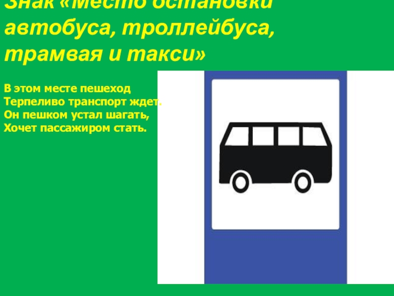 Знак «Место остановки автобуса, троллейбуса, трамвая и такси»В этом месте пешеход Терпеливо транспорт ждет. Он пешком устал