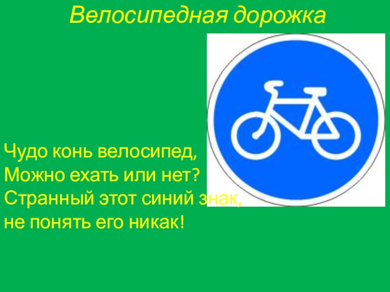 Слайд 21Чудо конь велосипед, Можно ехать или нет? Странный этот синий знак, не понять