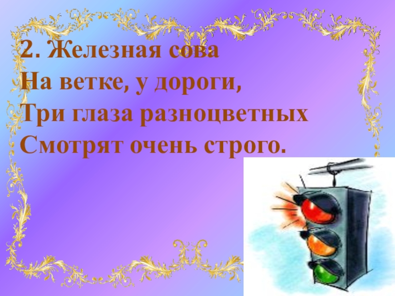 2. Железная сова  На ветке, у дороги, Три глаза разноцветных Смотрят очень строго.