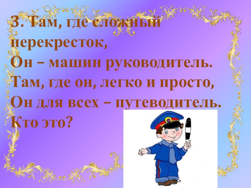 3. Там, где сложный перекресток, Он – машин руководитель. Там, где он, легко и просто, Он для